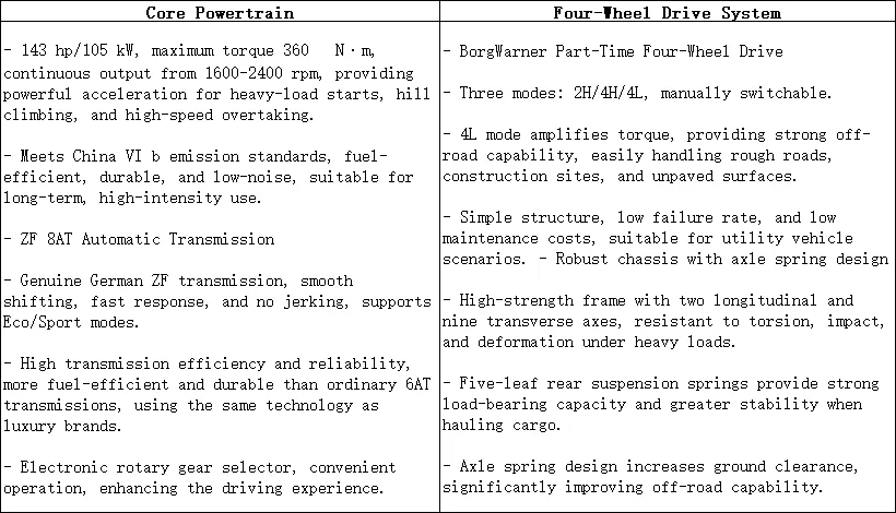 ລຸ້ນ 2026 RE-MAX 2.5T Automatic 4WD ມີຄວາມໄດ້ປຽບຫຼັກຂອງເຄື່ອງຈັກກາຊວນ Isuzu 2.5T + ລະບົບສາຍສົ່ງ ZF 8AT + BorgWarner part-time 4WD + HanDun chassis, ເນັ້ນຫນັກໃສ່ຄວາມງ່າຍໃນການນໍາໃຊ້, 4WD ທີ່ເຊື່ອຖືໄດ້, ຄວາມທົນທານຂອງລົດຫນັກ, ແລະເຫມາະສົມກັບທັງສອງຄອບຄົວ.